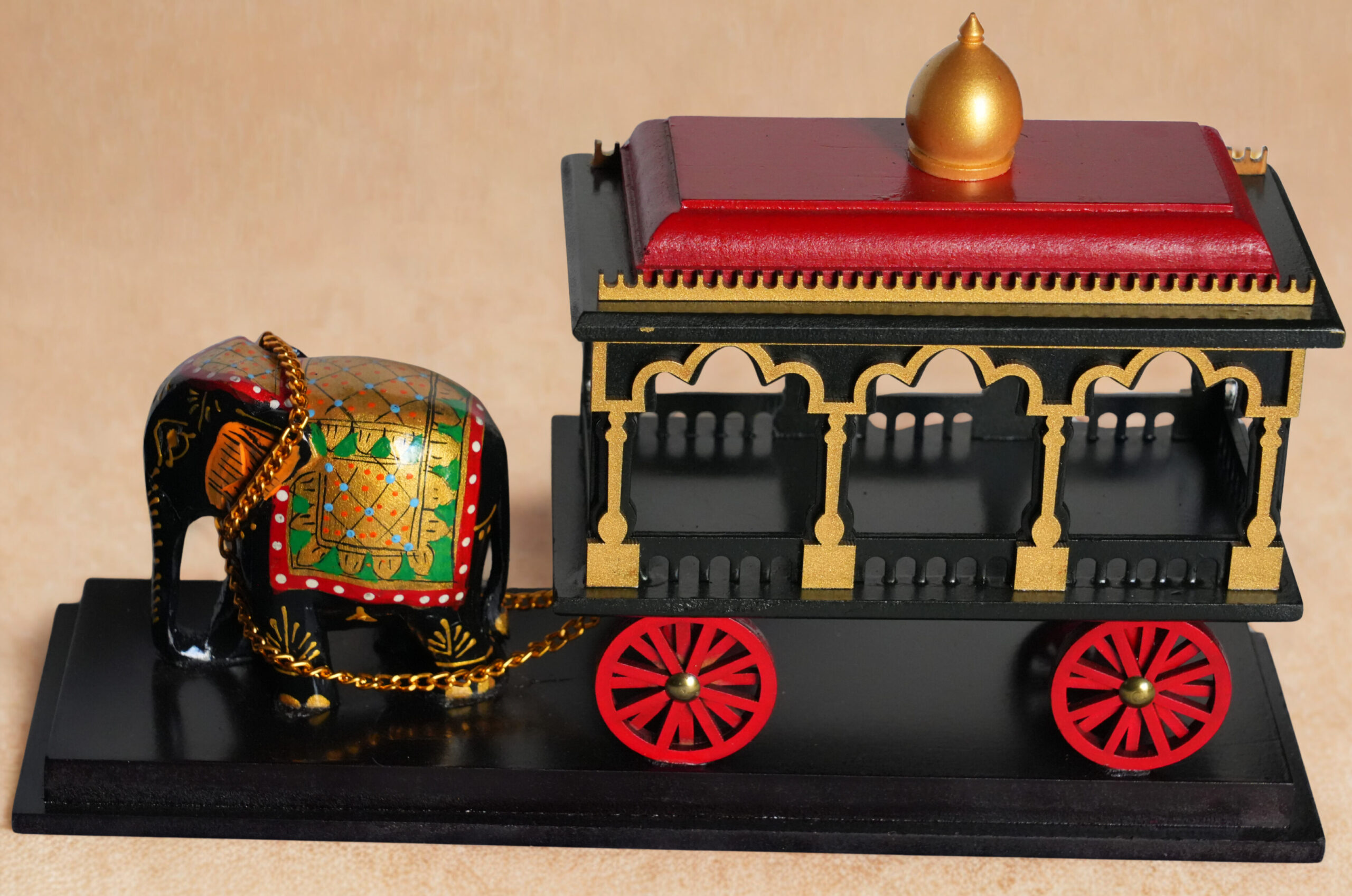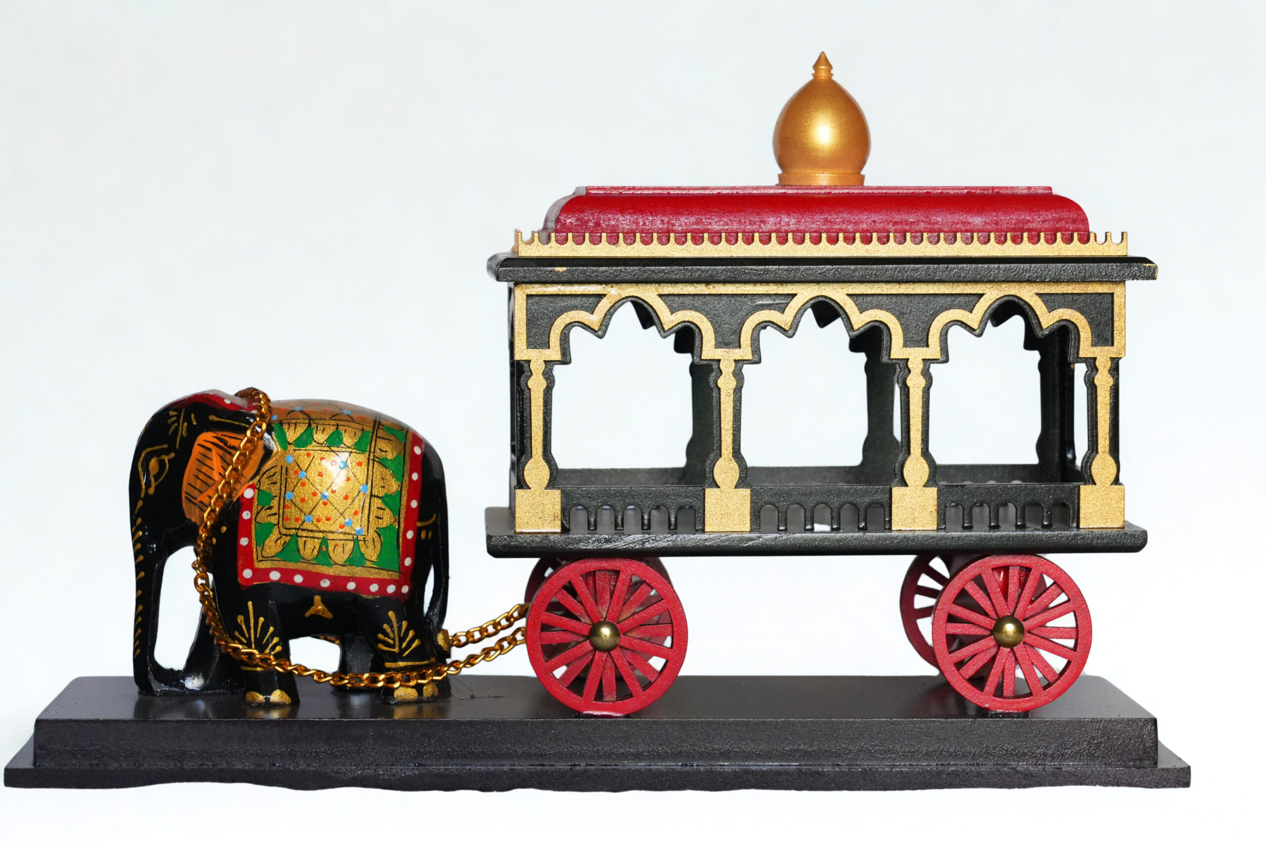 Step into India’s regal past with this handcrafted miniature sculpture from ANITHA FINE ARTS. Featuring a glossy black elephant adorned with a golden chain, pulling a richly decorated chariot with domed roof and arched windows, this piece captures the grandeur of traditional Indian processions. Painted in vibrant red, green, and gold, and mounted on a sleek black base, it’s a perfect blend of cultural storytelling and artisan finesse.