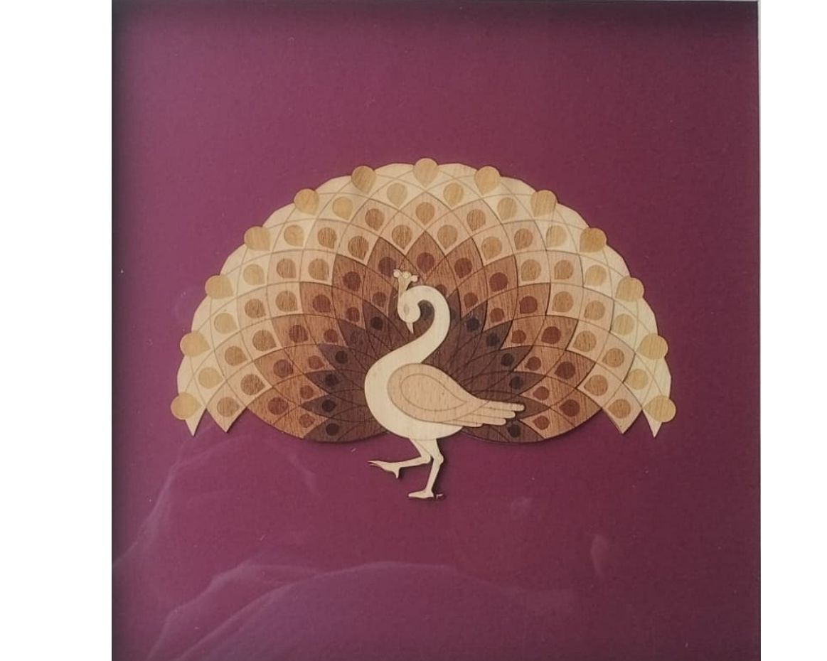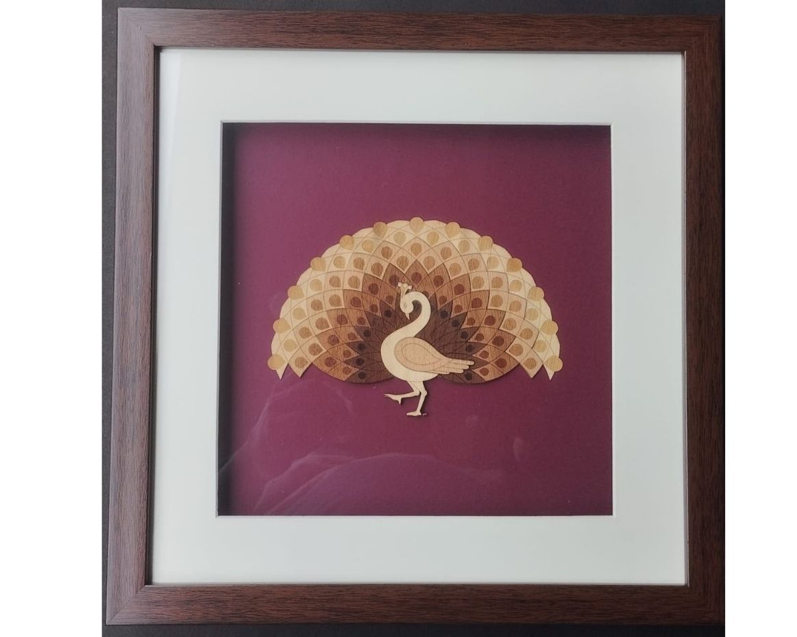 Elevate your space with the timeless elegance of Veneer Art, featuring a majestic, peacock design. This stunning piece showcases the rich heritage of Indian wood art craftsmanship, meticulously created using natural wood veneers in layered tones of brown, beige, and ivory. Each feather is precisely cut and arranged to form a symmetrical fan, radiating grace and harmony.