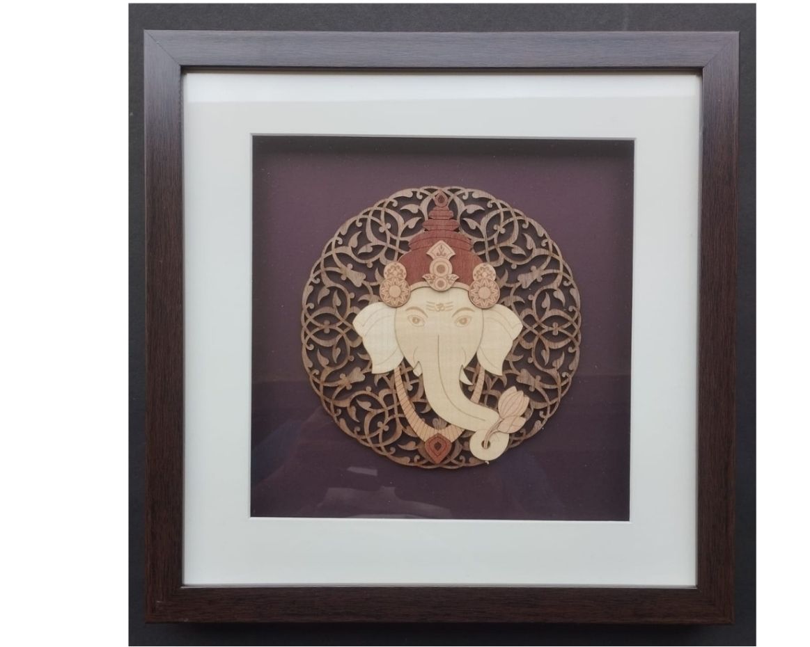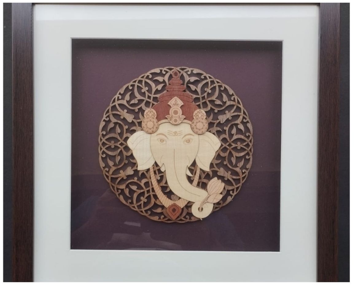 Invite divine energy and artistic elegance into your space with this laser-cut veneer artwork featuring a beautifully detailed Lord Ganesha seated within a circular floral mandala. Crafted using high-precision laser technology, this piece blends sacred symbolism with modern craftsmanship, highlighting Ganesha’s iconic features—elephant head, lotus in hand, and serene posture—rendered in layered natural wood tones.