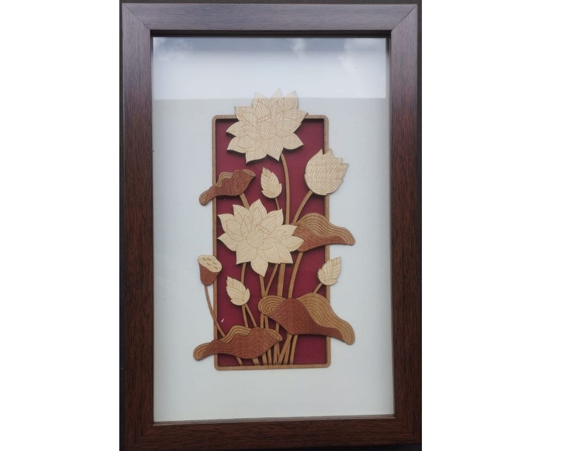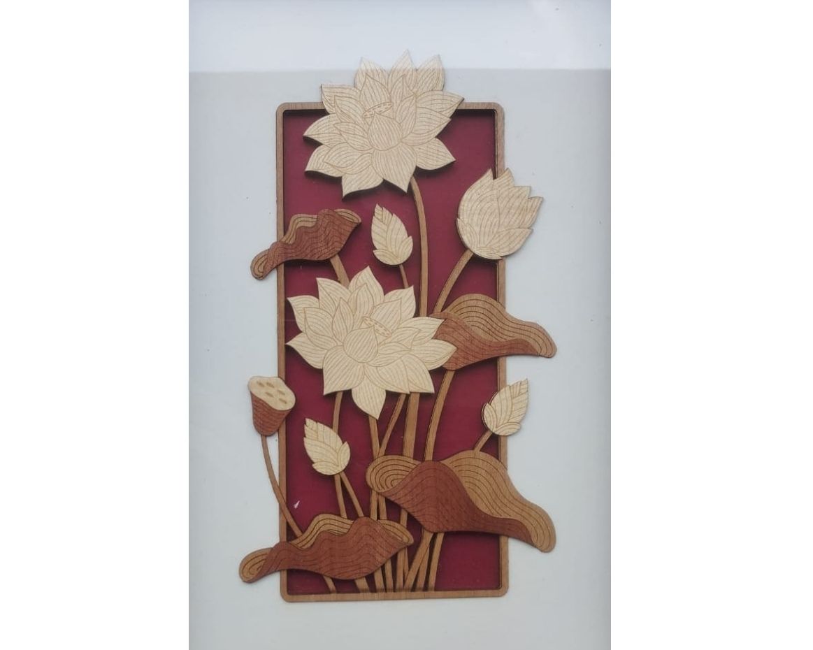 Transform your space with the timeless beauty of this laser-cut veneer artwork, featuring a graceful arrangement of lotus flowers, buds, and leaves. Crafted with high-precision laser technology, each element is delicately layered in natural wood tones and set against a rich red backdrop, creating a striking contrast that enhances the floral elegance.