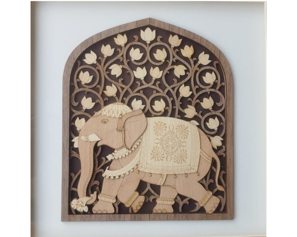 Celebrate the majesty of Indian heritage with this laser-cut veneer artwork featuring a beautifully adorned elephant motif, framed within a floral arch of lotus and vine patterns. Crafted with high-precision laser technology, this piece blends traditional Indian symbolism with modern design techniques, offering crisp detailing and layered wood textures that elevate any space.