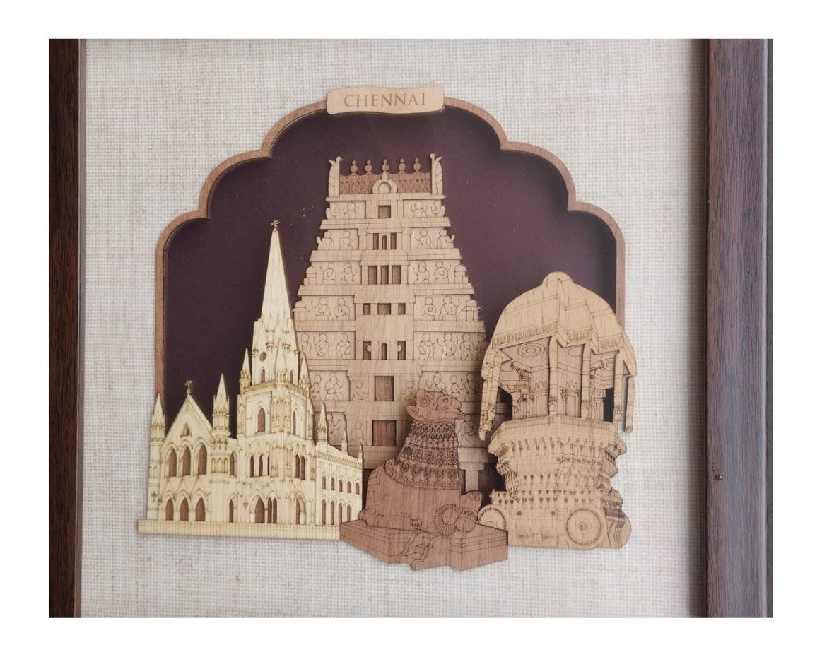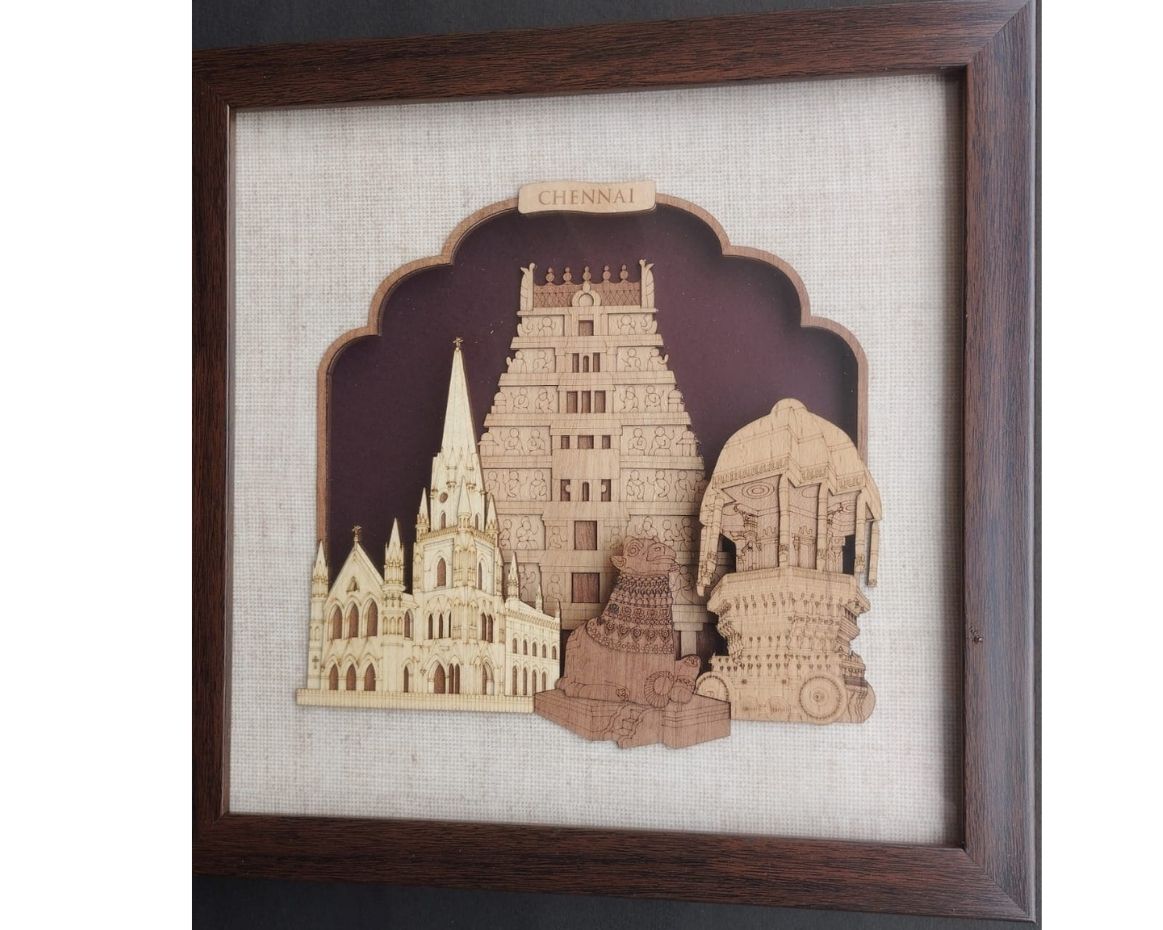 Celebrate the soul of Chennai with this exquisite veneer artwork, meticulously crafted to showcase the city’s iconic landmarks and cultural richness. This piece features detailed representations of Santhome Basilica, the majestic Kapaleeshwarar Temple gopuram, a traditional temple chariot (Ratha), and the revered Nandi bull, all carved in layered natural wood veneers and framed in a graceful arch design.
